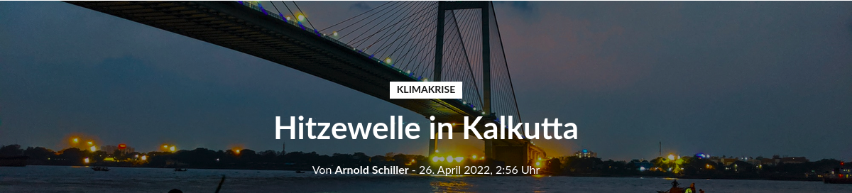 Für diesen Dienstag ist keine Besserung in Sicht, was die hohen Temperaturen und die Luftfeuchtigkeit anbelangt. Aufgrund der Kühlgrenztemperatur https://de.wikipedia.org/wiki/Kühlgrenztemperatur könnte es dieses Jahr für Menschen bedrohliche Wetterlagen aus der Kombination hoher Temperaturen und Luftfeuchtigkeit kommen. Kalkutta leidet unter der doppelten Belastung durch Hitze und Feuchtigkeit, schreibt https://www.telegraphindia.com/my-kolkata/news/kolkata-reels-under-twin-assault-of-heat-and-humidity/cid/1860987